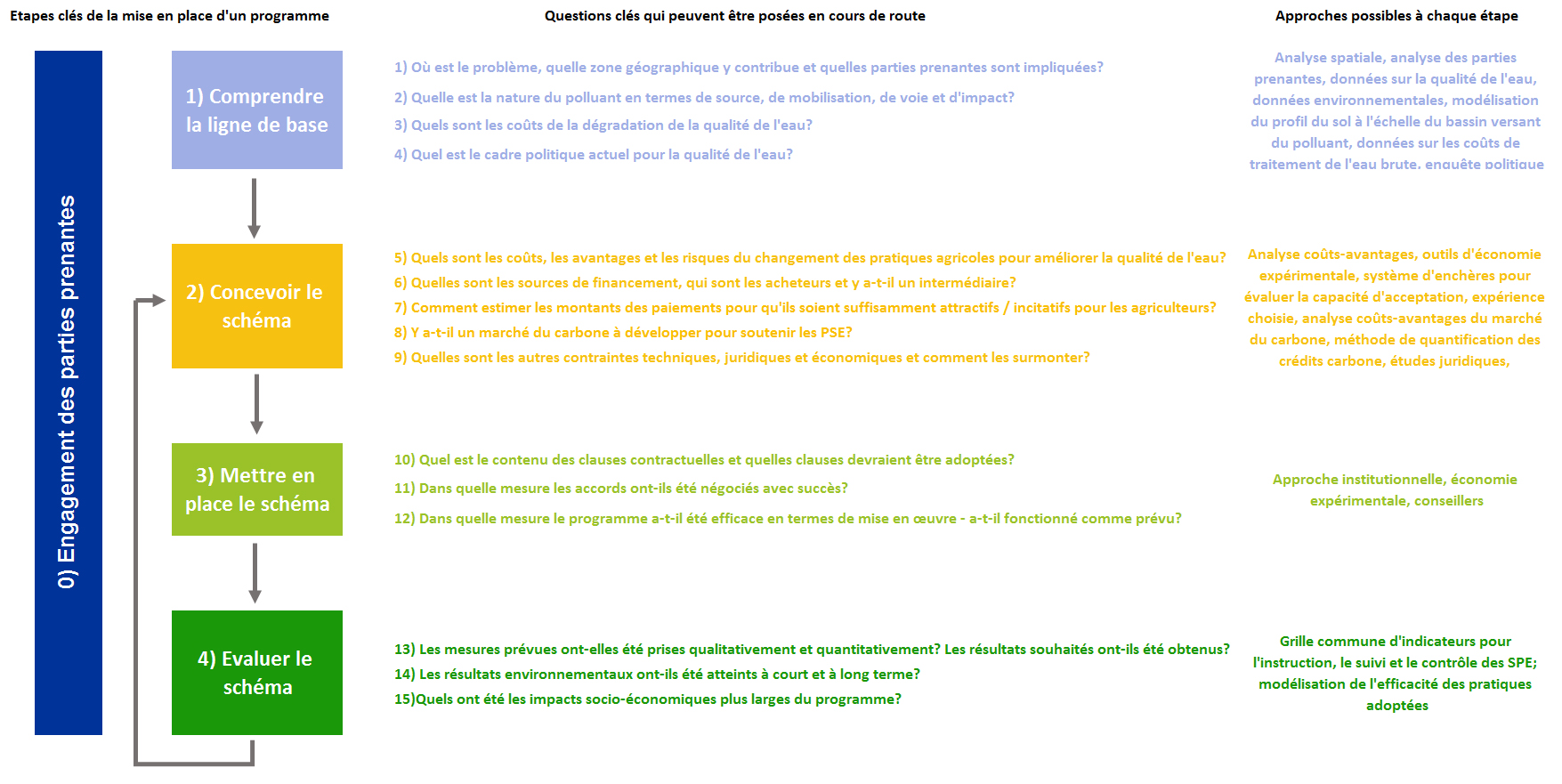 principalement autour du cadre de l'organigramme ci-dessous, qui met en évidence les étapes clés de l'établissement d'un programme. Il s’agit de «Comprendre la ligne de base», «Concevoir le programme», «Mettre en œuvre le programme» et «Évaluer le programme». L'engagement des parties prenantes est un thème qui se retrouve tout au long de la boîte à outils, car il a été utilisé à toutes les étapes par les partenaires du projet. Les types de questions qui pourraient être posées à chacune de ces étapes et les approches possibles pour y répondre sont illustrées dans le cadre cidessous. En tant que telle, la première option de filtrage permet à l'utilisateur de filtrer par étape des PES. Si vous laissez les cases à cocher vides, des outils seront affichés pour toutes les étapes, c'est-àdire que ce critère ne sera pas utilisé pour le filtrage.